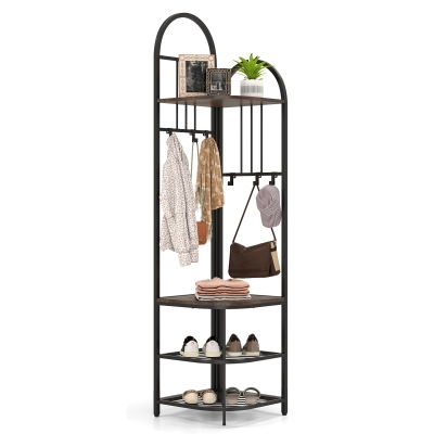 Corner Hall Tree, 71 Inch Tall Entryway Coat Rack with Shoe Bench & 4 Storage Shelves